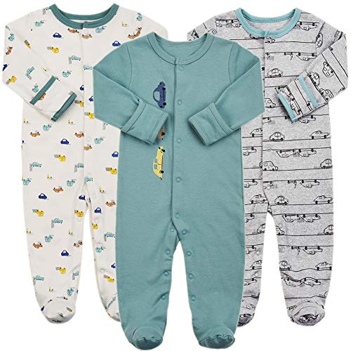 Aablexema Baby Footie Pajamas with Mittens – 3Pcs Infant Footed Sleeper Cotton Sleepwear Outfits (0-3m, Car Style(snap))