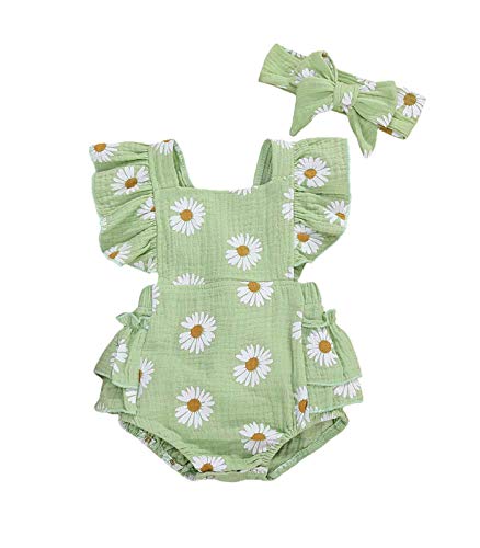 Baby Girls Daisy Playsuits Ruffled Bodysuit+Headband Print Fly Sleeve Romper Floral Jumpsuit Infant Summer Clothes (Green,6-12 Months)