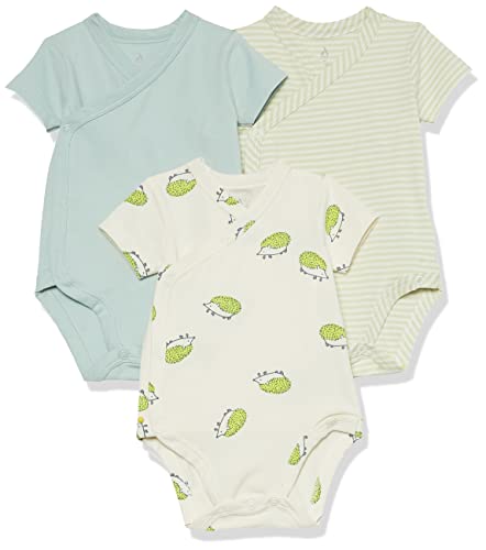 Amazon Essentials Unisex Babies’ Cotton Short-Sleeve Side Snap Bodysuit (Previously Amazon Aware), Pack of 3, Beige Hedgehogs/Light Olive Stripe/Pale Blue, Newborn