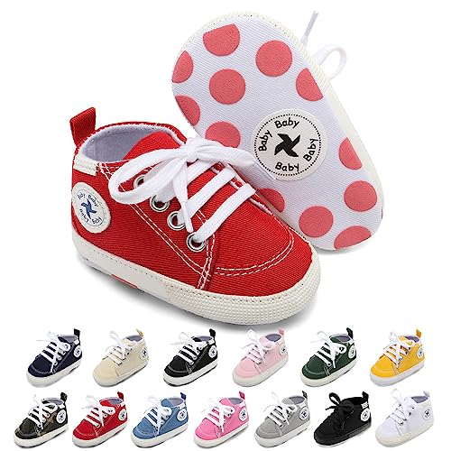 Baby Girls Boys Shoes Soft Anti-Slip Sole Newborn First Walkers Star High Top Canvas Denim Unisex Infant Sneaker (A01-Red, 6-12 Months)
