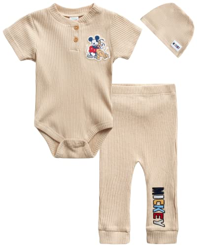 Disney Baby Boys’ 3 or 4 Piece Layette Set – Bodysuit, Pants, Hat, Booties – Mickey Mouse, Toy Story, Pooh (0-9M), Size 0-3 Months, Grey Mickey Friends