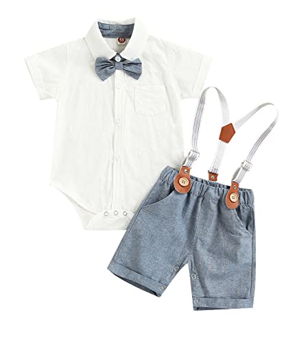 Qiylii Infant Baby Boys Short Sleeve Bowtie Buttons Bodysuit Shirts Suspender Shorts Casual Summer Clothes (Sky Blue, 3-6 Months)