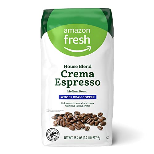 Amazon Fresh House Blend Crema Espresso whole bean coffee is light-medium roasted to match the traditional Italian style espresso for a full crema, balanced flavor and less oily beans. Enjoy rich notes of caramel and cocoa, with long-lasting crema. Best used for automatic or manual espresso machines and coffee makers.