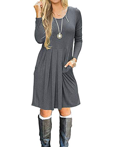 AUSELILY Lady Crewneck Long Sleeve Dresses with Pockets Simple Plain Swing Dress Empire Waist (M, Dark Gray)