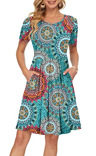 AUSELILY Women’s Summer Short Sleeve Loose Swing Casual Print Floral Pleated Dress Pockets Knee Length (XS, H Green)