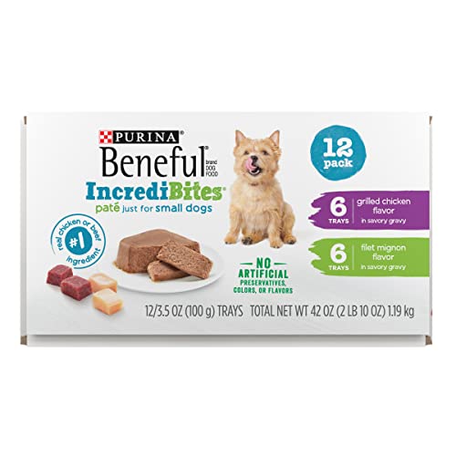 Answer the unique dietary needs of your lovable small breed dog with a Beneful IncrediBites Grilled Chicken Flavor and Filet Mignon Flavor Wet Small Breed Dog Food Variety Pack. These exciting small breed dog food recipes are specifically formulated for adult small dogs with a protein-rich pate recipe featuring real chicken or beef as the number one ingredient to deliver 100 percent complete and balanced nutrition. This great tasting pate dog food is perfectly textured for small dog mouths to chew and will get your dog’s tail wagging every time you serve them up a convenient single-serve Beneful IncrediBites dog food tray. With no artificial preservatives, colors or flavors, this high protein dog food offers your lovable small breed dog everything they need and nothing they don’t. Show your small dog big love by indulging their big appetite for delicious natural dog food flavors with Purina Beneful IncrediBites adult dog food today.