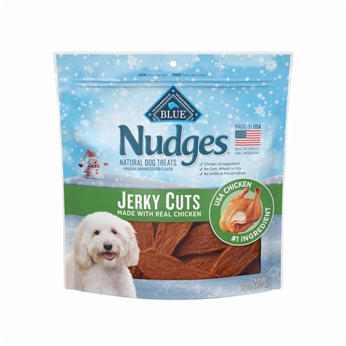 PACKAGING MAY VARY: Contains one (1) 16oz bag of BLUE Nudges Jerky Cuts Natural Dog Treats, Chicken