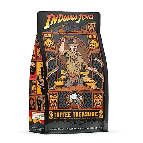 Bones Coffee Company Toffee Treasure Flavored Coffee Beans & Ground Coffee Toffee Flavor | 12 oz Medium Roast Arabica Low Acid Coffee | Gourmet Coffee Inspired By Indiana Jones (Whole Bean)