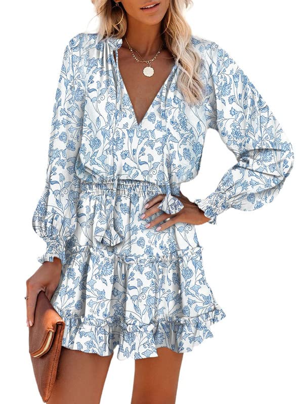 Dokotoo Womens Ladies Cute Spring Casual Spring Sexy Deep V Neck Ruffle Chiffon Floral Print Lantern Long Sleeve Elegant Empire Waist Flowy Mini Short Skirt Dresses for Women Party 2023 Large