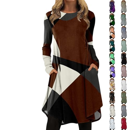Early Now Holiday Dresses for Women, Empire Waist Classy Winter Dress for Womens Long Sleeve Office Crewneck Cotton Evening Dresses Loose Fit Print Pocket Comfortable