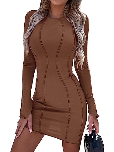 PRETTYGARDEN Womens 2023 Fall Bodycon Mini Dresses Casual Long Sleeve Solid Color Short Tight Ladies Party Club Fashion Dress (Coffee,Small)