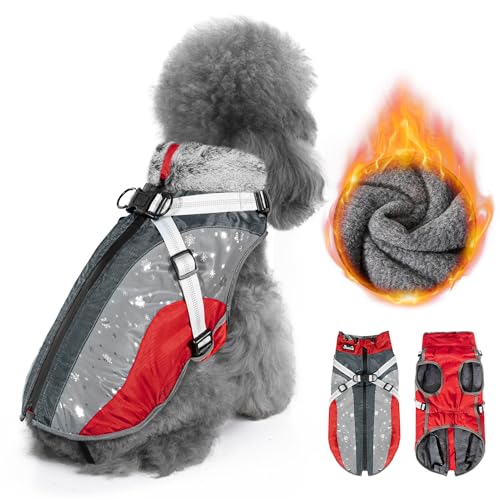 SlowTon Dog Jacket with Harness Built in, Waterproof Fleece Winter Warm Dog Coats for Small Medium Dogs, Reflective Adjustable Furry Puppy Vest Clothes for Outdoor Walking (Red,Size X-Small)
