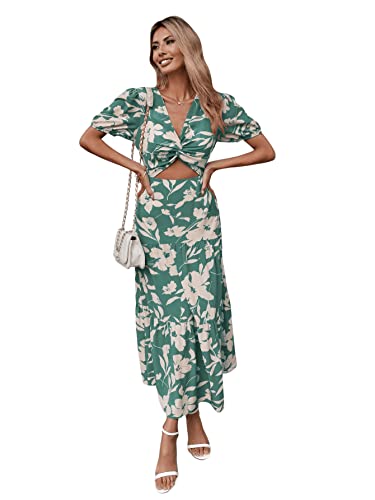 SweatyRocks Women’s Boho Floral Puff Sleeve Cut Out Dress Tie Back A Line Midi Dresses Flower Green L
