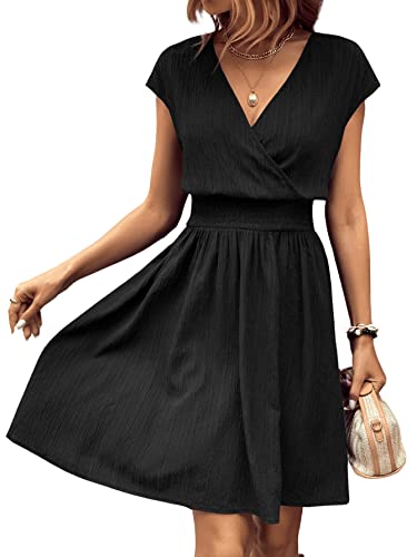 SweatyRocks Women’s Short Batwing Sleeve Cross Wrap V-Neck A-line Casual Swing Dress Plain Shirred Flared Short Dress Black L
