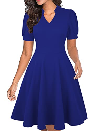 Womens Summer Short Sleeve Royal Blue V Neck Knee Length Fit and Flare Cocktail Retro Modest Teacher Dinner Business Casual Office Wedding Guest Ladies Dresses with Pockets XL